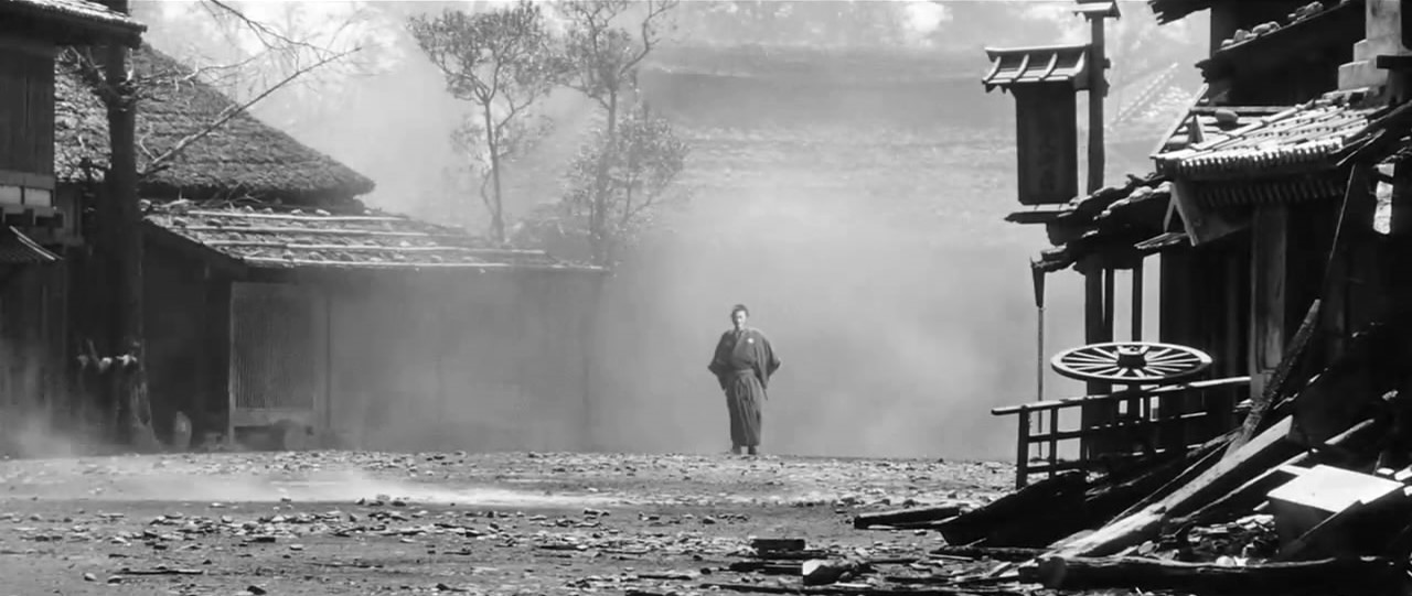 除了上述那个电影开篇的镜头,电影结尾整个一幕的视听语言也很考究,不仅整体调色都是统一的金黄色,对烟雾风沙的运用也让人想起黑泽明的武士电影《用心棒》中的名场面。