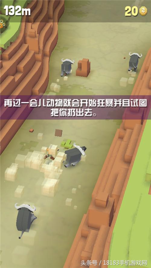 骑在动物身上时需要按住屏幕不松手,在确保前方有可骑乘的动物时,才可松开屏幕向前跳起,否则就只能眼睁睁的看着牛仔摔成碎块儿,这样看来又有点像微信里的“跳一跳”。