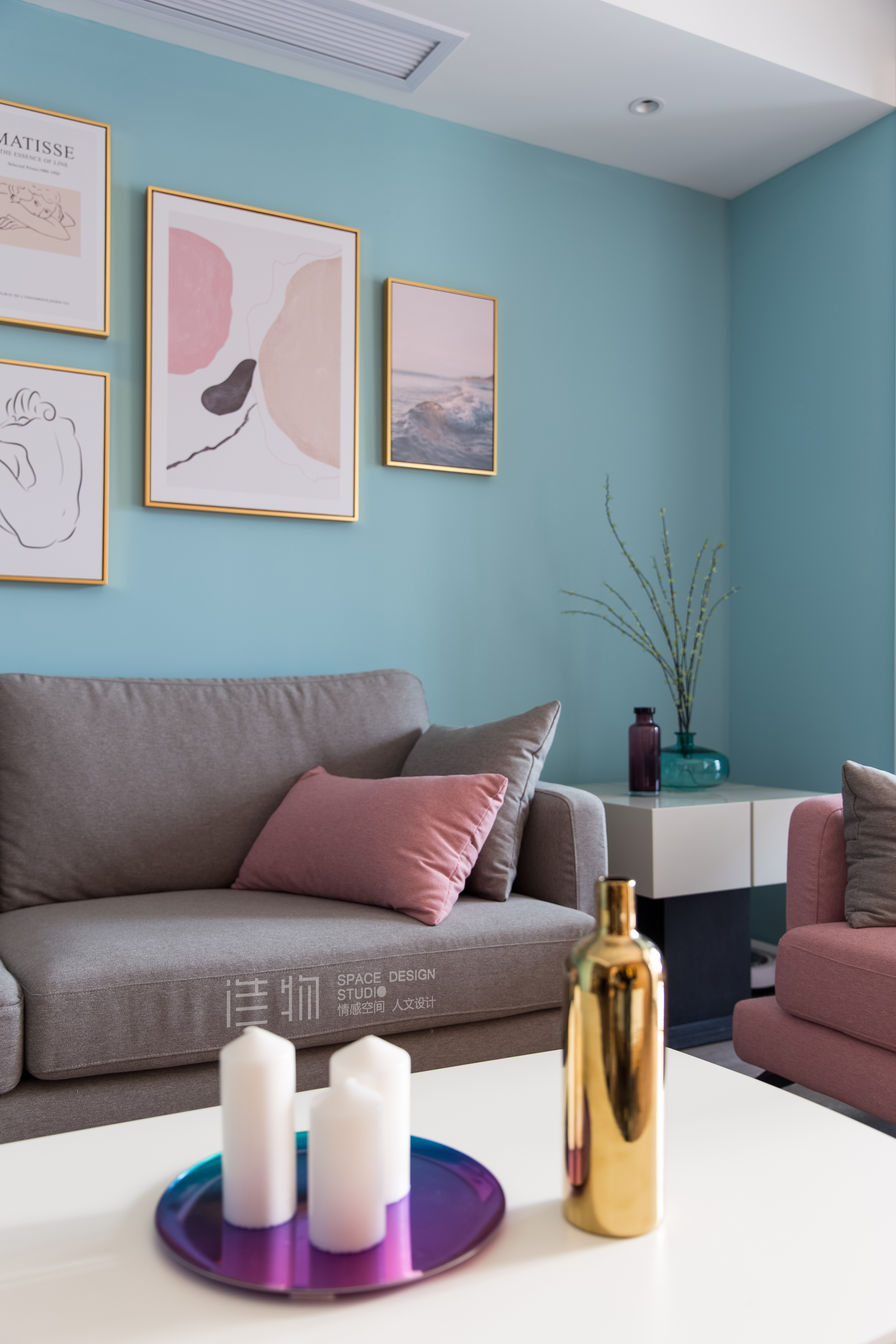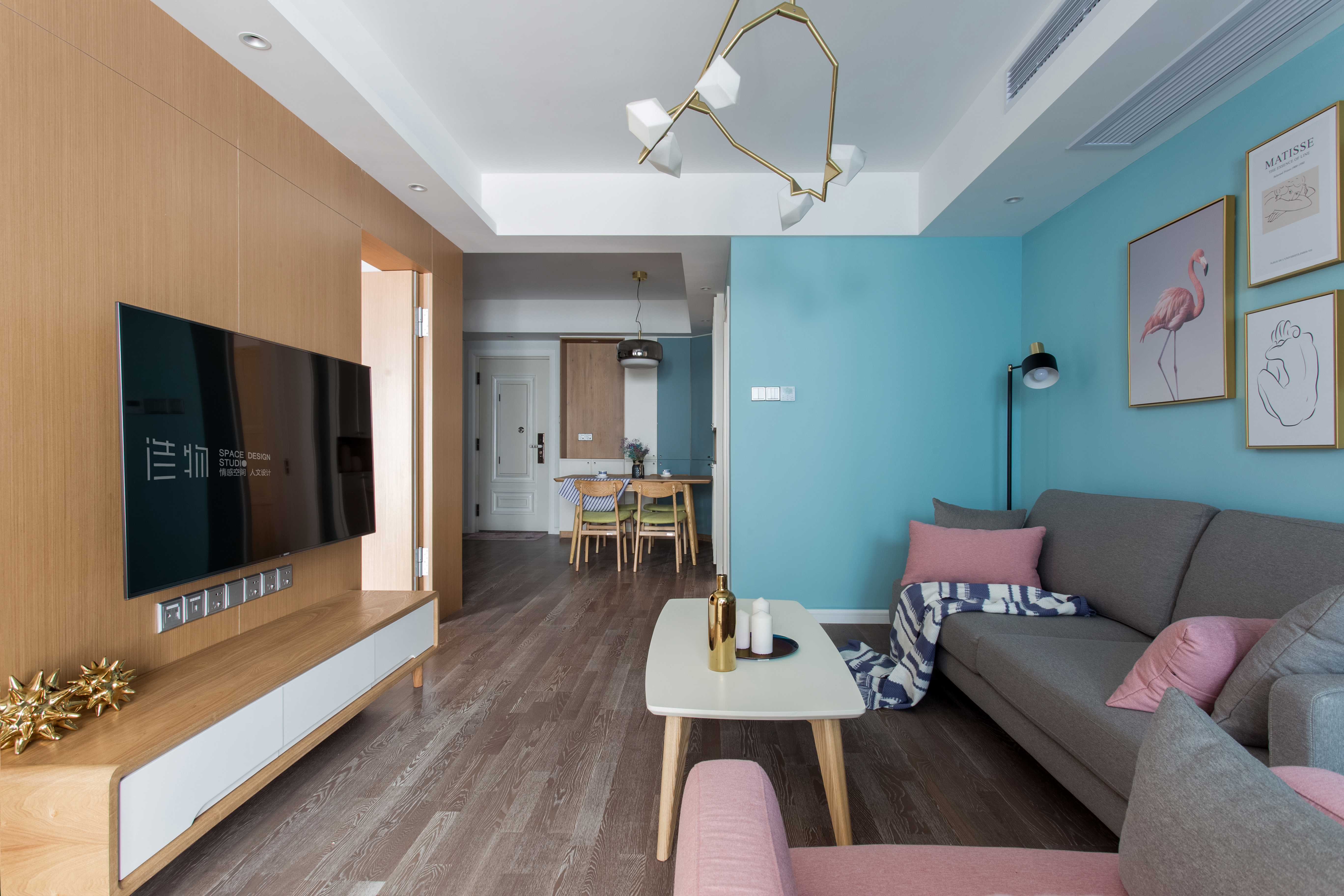 布艺灰调沙发,水浅蓝与pink在空间的撞色,还有经典的原木与白,明亮利落的北欧氛围跳脱而出,感受到屋主大女孩和小女孩满满的少女心~少量硬朗的细黑线条,收拾掉空间的色彩张力,让这小小的幸福满而不溢
