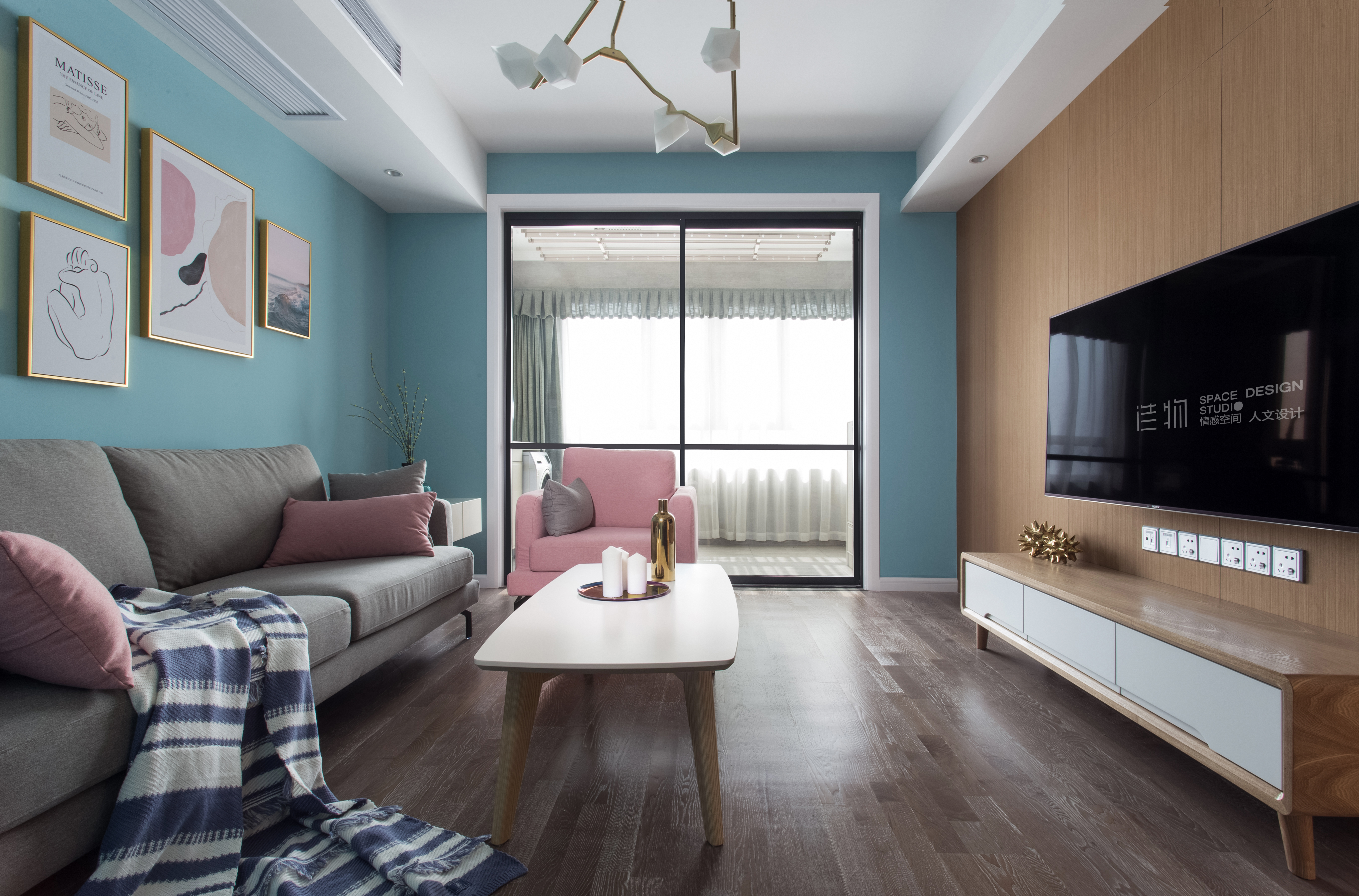 大面的玻璃移门,让日光与色彩充分融合。窗明几净,最简单最清爽的舒适感就是这样了。