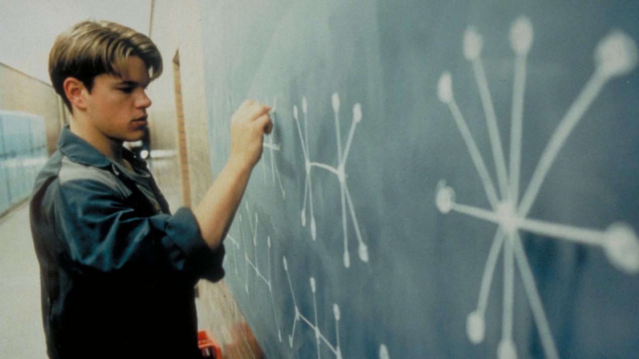 电影刚开始是这样式的,在麻省理工的一个大学课堂里,数学系教授在走廊小黑板上给学生们布置了一道题,到这学期结束时如有人能答出来,收获的不仅是好看的成绩,还能在学校名声大振,在学校当清洁工的大帅看见这道题后有魔怔了,早早结束了自己丰富的夜生活,回到家仔细演算着那一道题,不一会儿就到学校把答案写了上去。