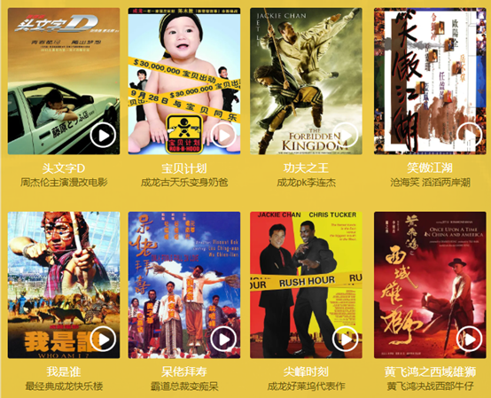 香港电影:《头文字d》、《宝贝计划》、《功夫之王》、《笑傲江湖》、《我是谁》、《呆佬拜寿》、《尖峰时刻》、《黄飞鸿之西域雄狮》。