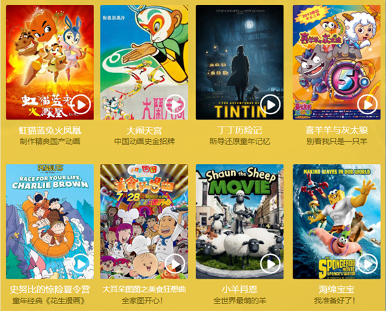 动画篇:《虹猫蓝兔火凤凰》、《大闹天宫》、《丁丁历险记》、《喜羊羊与灰太狼》、《史努比的惊险夏令营》、《大耳朵图图之美食狂想曲》、《小羊肖恩》、《海绵宝宝》。