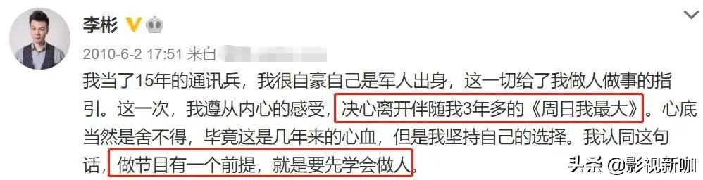 2010年6月2日,退出《周日我最大》节目录制的李彬发了一条一语双关的微博,他说:“做节目的一个前提,就是要先学会做人。”正因为这句话,李彬无意之中得罪了不少人,因而被雪藏失去了很多主持机会。