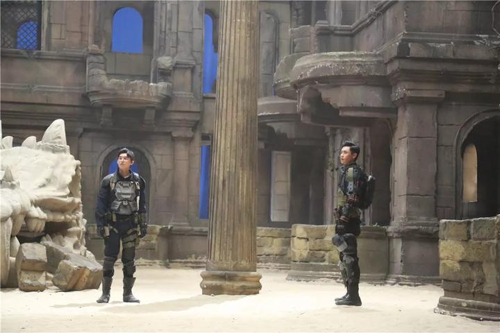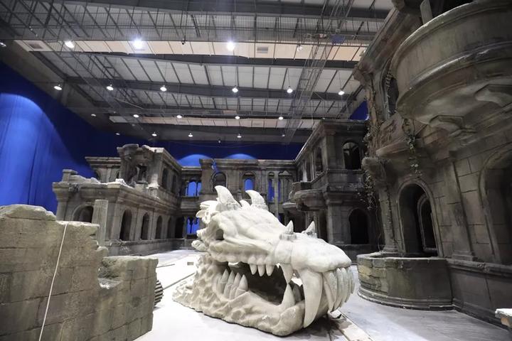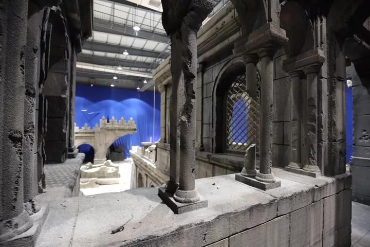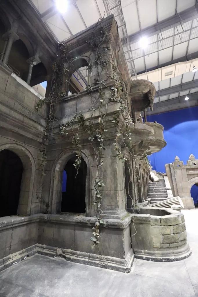 “先用钢筋做构架,用木板、泡沫造型,喷漆,为了凸显年代感还在每一个细节上磨砂……”孔宪军说起沙漠古堡的场景搭建滔滔不绝,“这个棚大概耗资七八百万。”