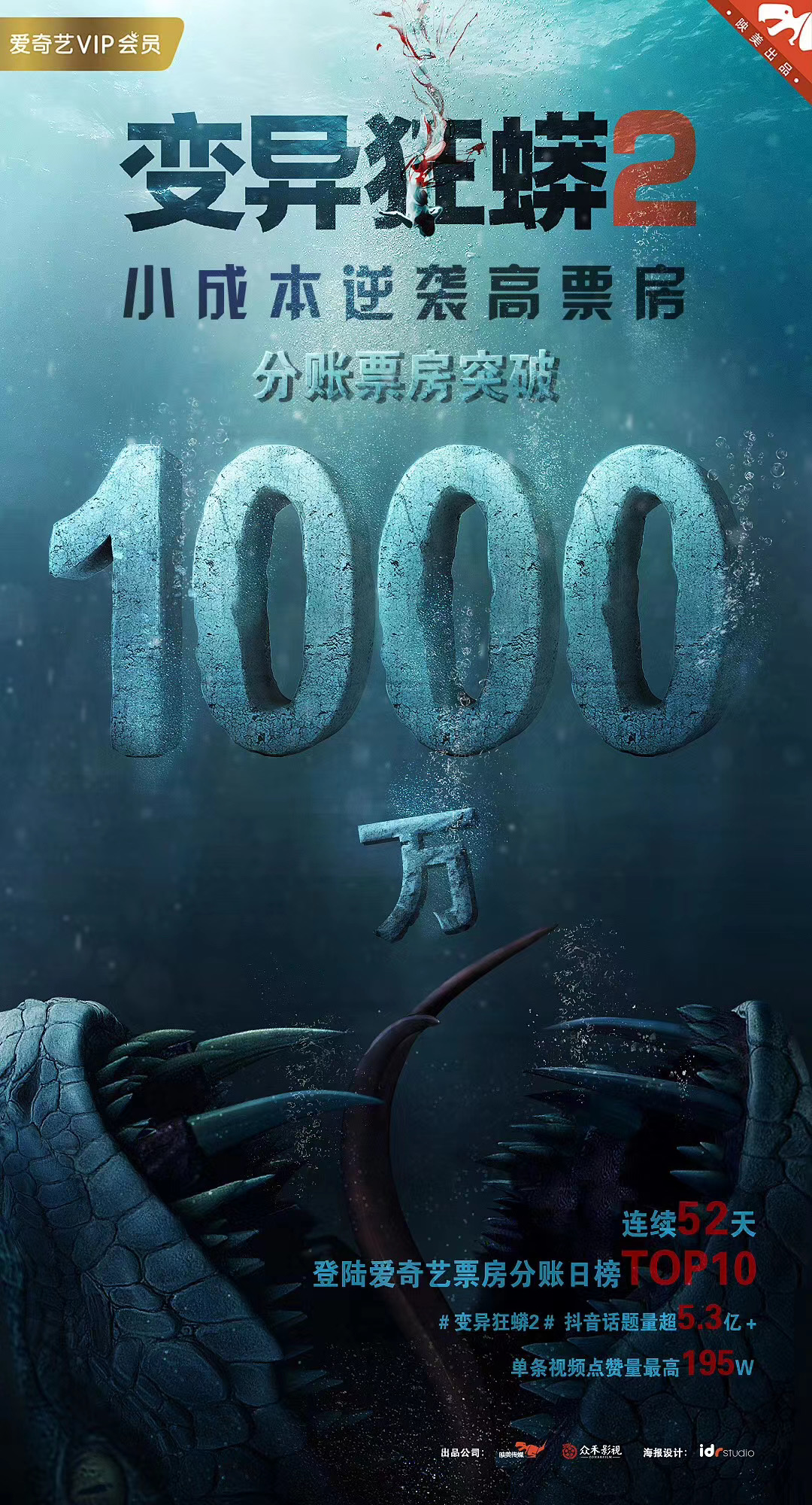《变异狂蟒2》自4月3日至5月22日连续52天,登录爱奇艺票房分账日榜top10,抖音话题量超5.3亿,单条视频点赞达195万,票房分账突破1000万,创网剧爆款新势力。