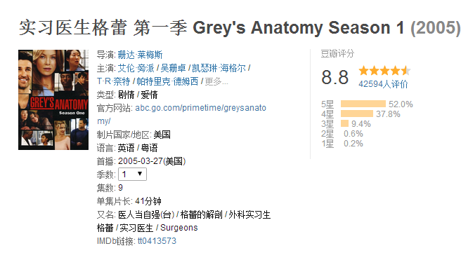 美剧《实习医生格蕾》,第一季豆瓣评分8.8;