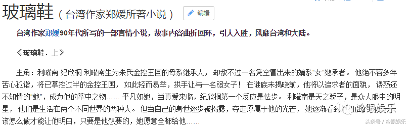 在吐槽之前,首先我觉得我们应该明确一个事情,那就是《遇见爱情的利先生》到底是怎么改出来的。百度百科上显示这部剧是根据郑媛的小说《玻璃鞋》改编的,但《玻璃鞋》的内容和这部剧除了人名基本上没有关系。《玻璃鞋》的大概剧情是,利曜南和纪欣桐争财产,争着争着争出真爱来了,特别台湾。
