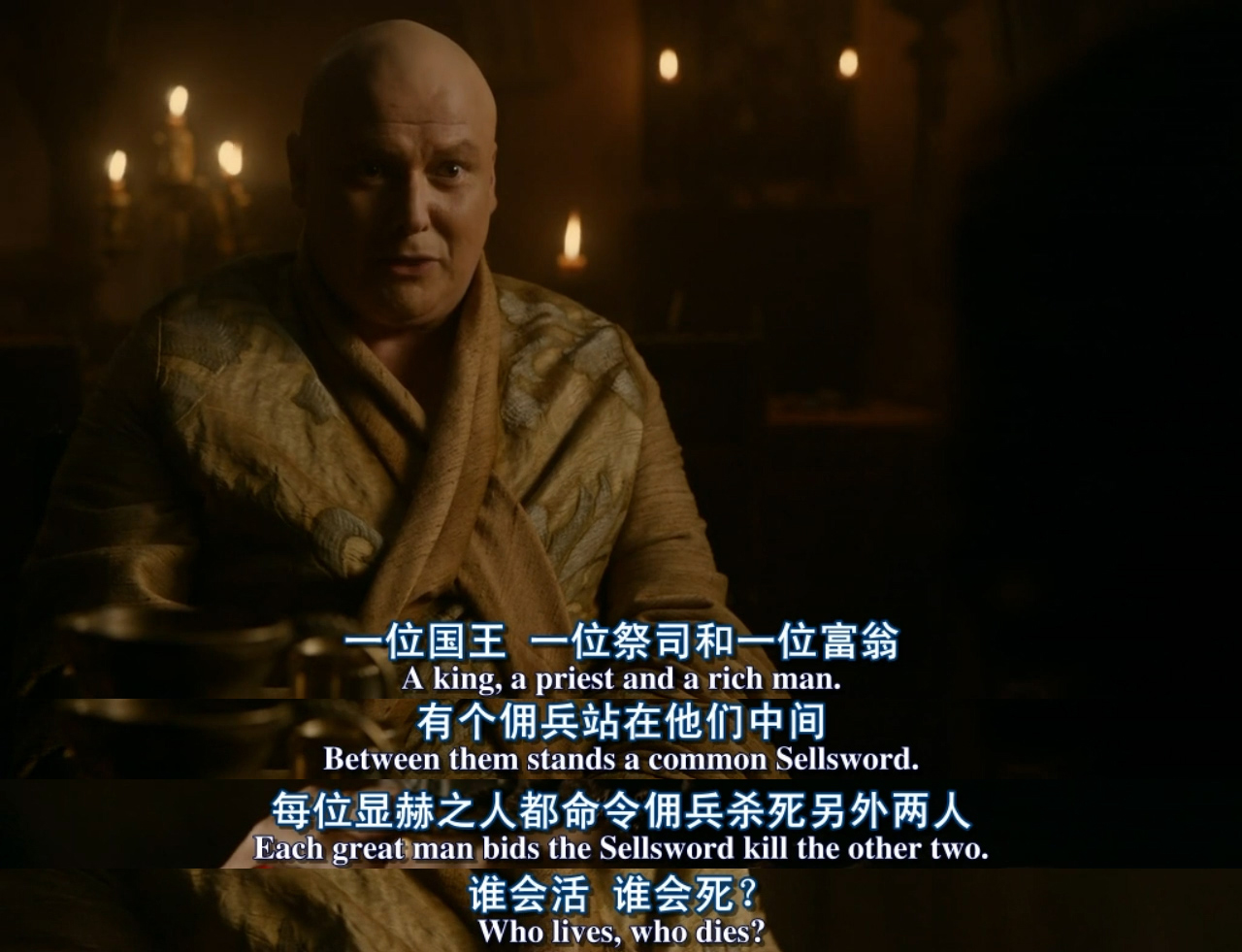瓦里斯和小恶魔坐在桌前,瓦里斯用一个哑谜传达了他的目的和思想。