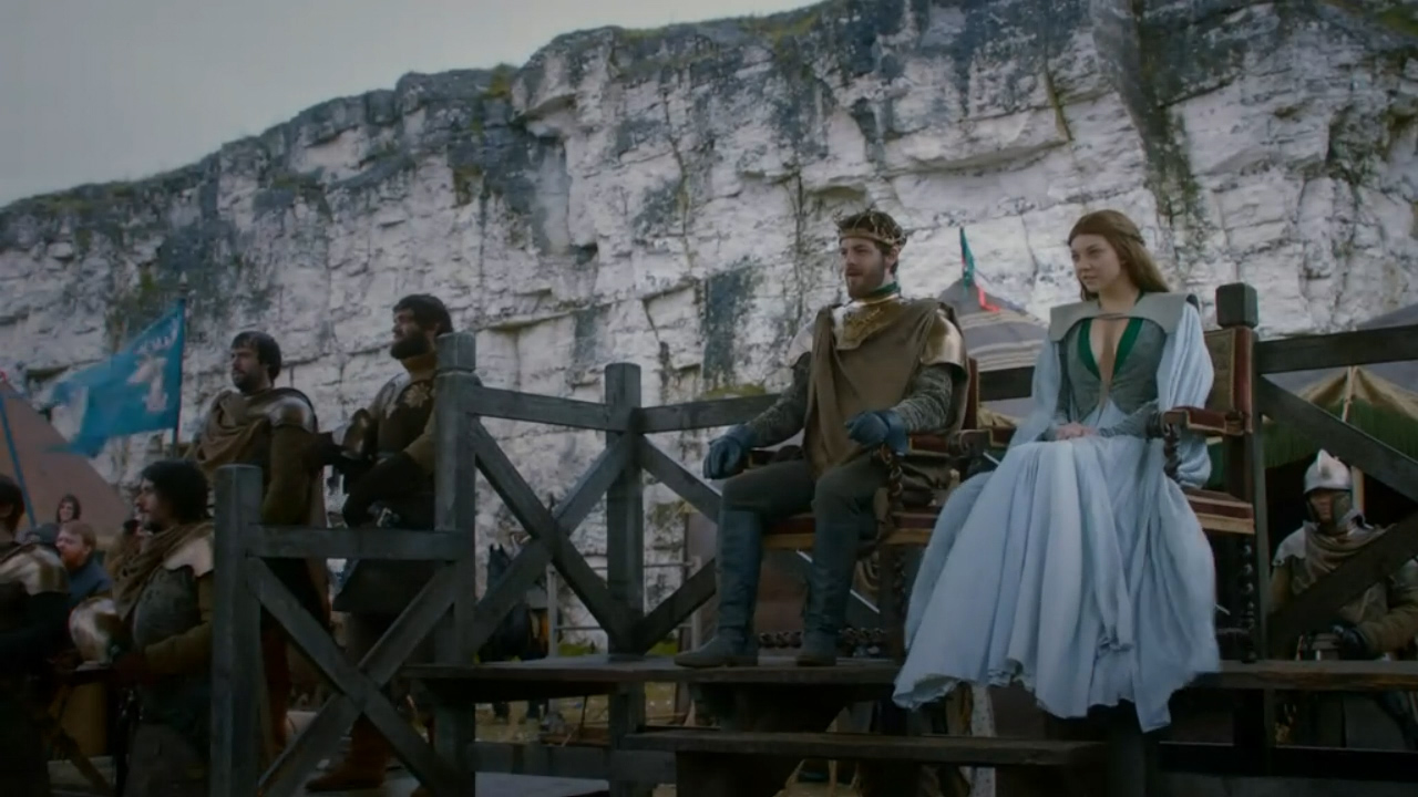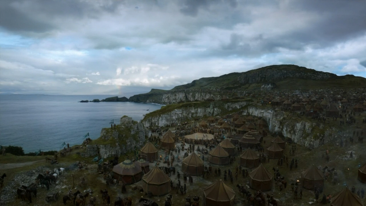 破船湾中停着几艘渔船,阳光明媚,水面平静,时而荡起涟漪,波光粼粼,寻着喧闹声进入风息堡,蓝礼拜拉席恩为庆祝与马格里提利尔的婚礼,举办了比武竞技。两位将士在台下角逐,周围围满了人,鼓舞喝彩,像极了太平盛世。凯特琳刚好赶上了这一幕。能不能规劝蓝礼出兵,她心中忐忑但不显于色。