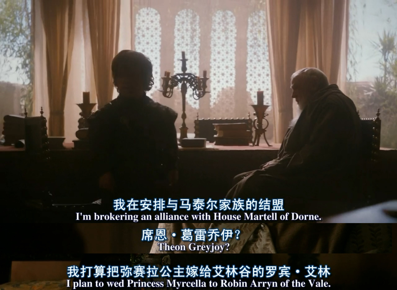 君临如今平静的乱七八糟,小恶魔苦心周旋,他想出一个妙招,把弥塞拉嫁出去寻找联盟,他分别吧消息告知派席尔,小指头和瓦里斯,一共三个版本,并告诉他们不许告知瑟曦,通过这个方法来确认他们之间和瑟曦的关系。很奏效,派席尔在第一时间告知了瑟曦,他将派席尔抓起来,以获取更多瑟曦的秘密,他要全盘操控,不留一点缝隙。小指头被指派去找凯特琳,带着艾德的遗体,要凯特琳秘密释放詹姆,换取两个女儿的自由。这招之后,小恶魔认为瓦里斯是可以交的朋友,而瑟曦是第一次被小恶魔整的这样无力还击。