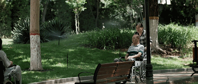 某小区公园,妻子推着患有脑血栓的丈夫,在公园里散步。