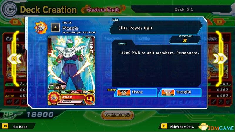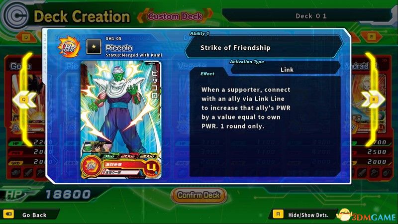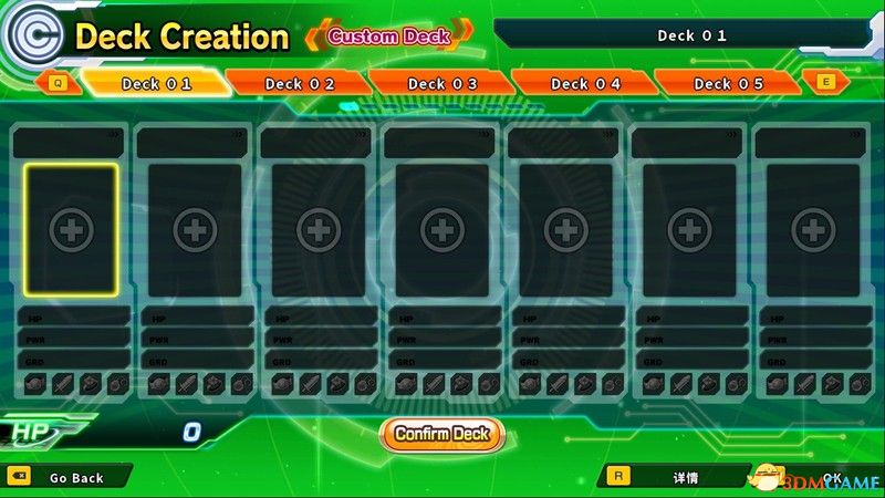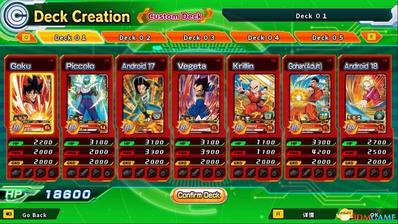 玩家可以在deck creation里自由组卡。deck01、02就是你的不同套牌。每个套牌由7张龙珠英雄卡组成。