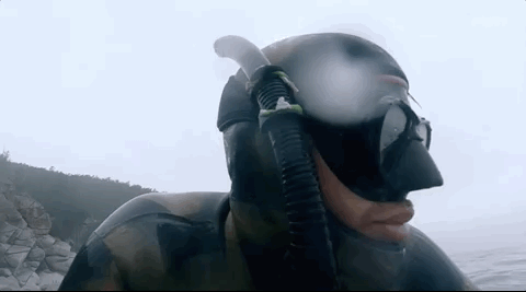 为了水下拍摄,帕特里克佩戴了全脸循环呼吸器。