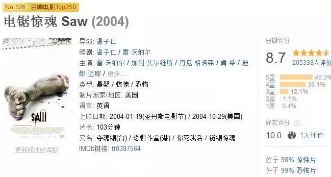 时至今日,《电锯惊魂》第一部还在豆瓣top250稳坐一席。