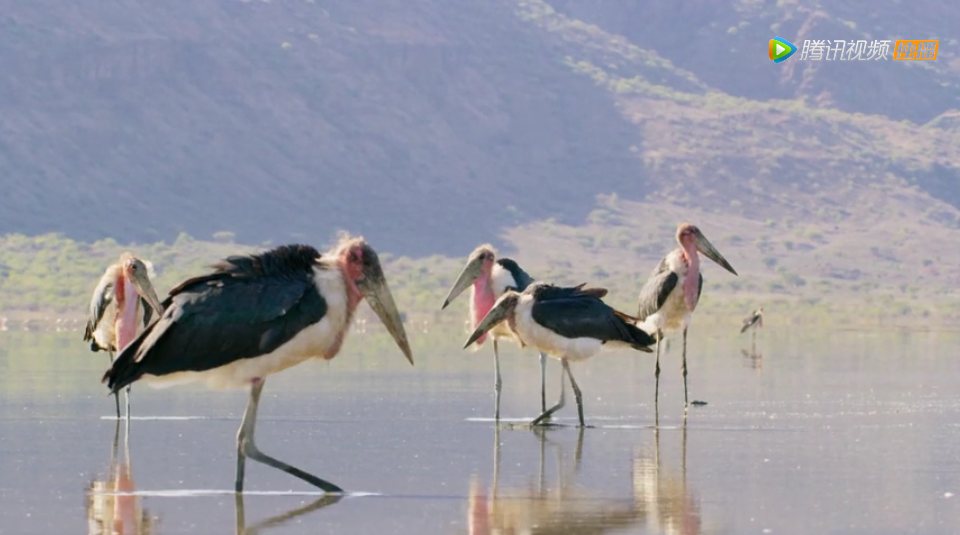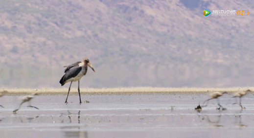 红鹳雏鸟拼命跑,秃鹳的长腿让它不着急的底气,它只是慢慢地走。