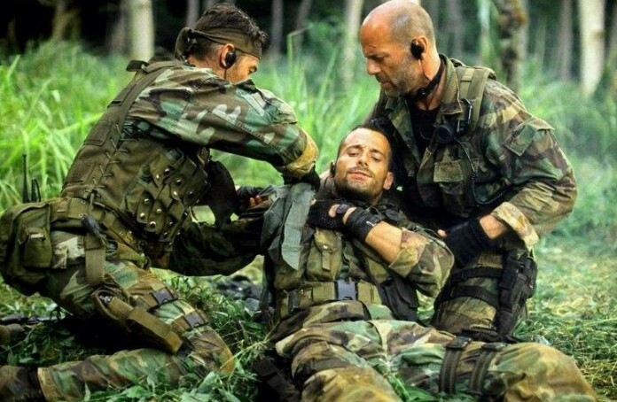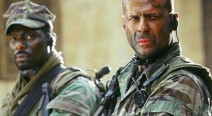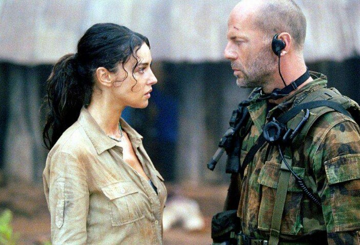《太阳之泪》以大手笔将残酷,混乱,血腥的战争场面演绎在观众面前,镜头往细节里推动,捕捉那一丝在炮弹呼啸声中死亡临近个体的感觉,这种感觉非关爱恨非关正义,在被死亡者的眼睛中你能找到的只有绝望和恐惧,透过断壁残垣下的鲜血和灰尘,在偶然的寂静中喘息的士兵正在紧张不安地等待命运的降临,或者更像困兽犹斗———也许昨天还和你一起奔跑的双腿,下一秒其中的一条已经躺在沙砾中安息了,也许正当你拉开枪栓的那一刻你却听到了子弹撞击自己胸口的声音,在慢镜头中跌倒的会是谁呢?生死搏斗中,原来没有什么浴火凤凰不死英雄,在概率面前,我们每个人下地狱的可能性是一样的。
