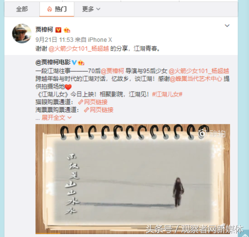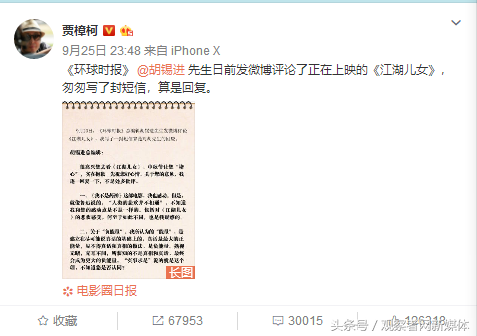 本来《江湖儿女》的话题已经逐渐冷却,却不想胡锡进意外加入战场,给这部电影的热度推波助澜。面对送上门来的机会,贾樟柯自然不能放过,25日发布长微博回应胡锡进,评论和点赞数都是创下电影上映后新高。