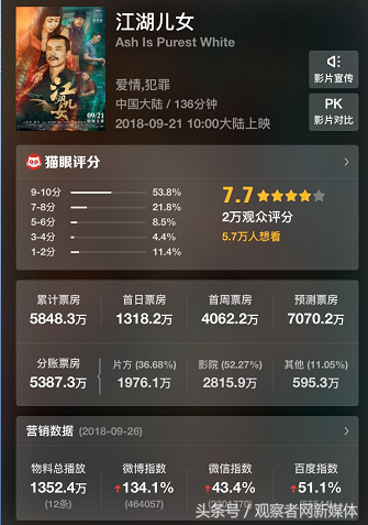 同时查看猫眼相关数据,26日《江湖儿女》微博和微信讨论量大幅增长。
