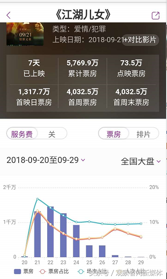 在这样的宣发攻势下,《江湖儿女》首日排片达到5.5万场,占比超过15%,也创下了近年来文艺片排片场次新高。但是上座率却不理想,在中秋节小长假期间,票房逐日下滑。和以往贾樟柯的作品类似,随着小长假结束,《江湖儿女》第一波铁杆观众都观影完毕,后续票房基本就到此为止了。