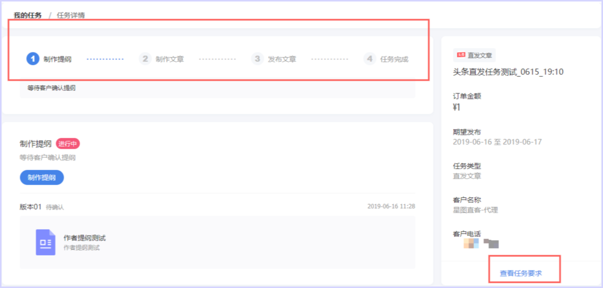 - 制作提纲:任务是否需要大纲由客户选择。如大纲被驳回,将收到短信提醒。可在「任务详情」中查看驳回原因,修改后再次提交。客户有3次驳回大纲的机会,第3次自动进入写稿环节。提纲确认后,作者将收到短信提醒,开始文章制作