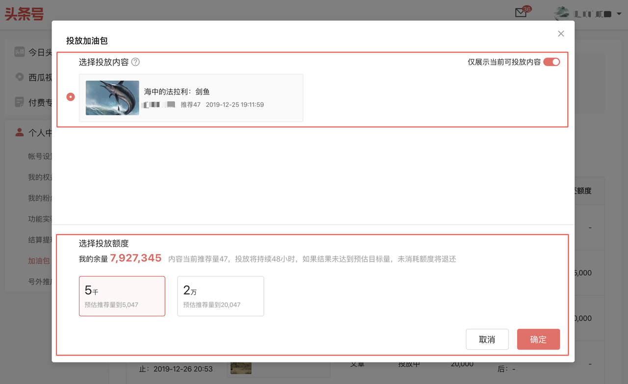 ② 勾选要投放的内容,并为其设置投放额度,目前仅支持5000和20000两个推荐量档位。
