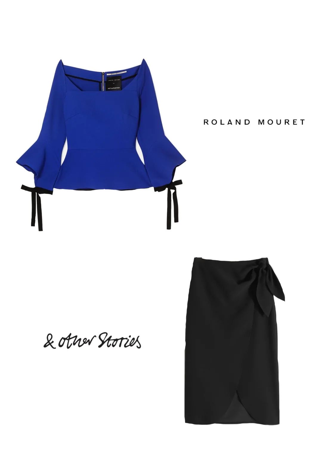 去见大师pierre cadin时她则以一件宝蓝色roland mouret不规则宽领上衣搭配& other stories的黑色开衩半裙,尽显性感妩媚,腰间加上紫色腰带形成撞色点缀,时髦功力显而易见。