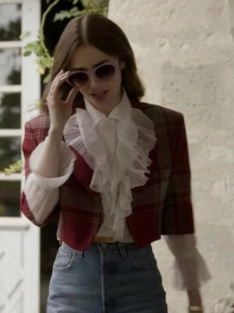 在家宴中emily身穿vivienne westwood经典红色格纹西装内搭复古宫廷褶皱领衬衫,复古法式style呼之欲出,再加上一双christian louboutin的绿色高跟鞋,以致让camille17岁的弟弟“阴差阳错”地对emily一见钟情。