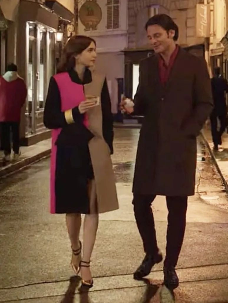 不过camille的弟弟只是一个插曲,真正让emily心猿意马的则是大师pierre cardin身边的弟子mathile cardin,在与mathile漫步在浪漫的巴黎街头时,emily仅用一件river island的拼色大衣就拿下了他,宽大轮廓大衣是法国人在秋冬的不二之选,也诠释着法式风格慵懒自由的特性。