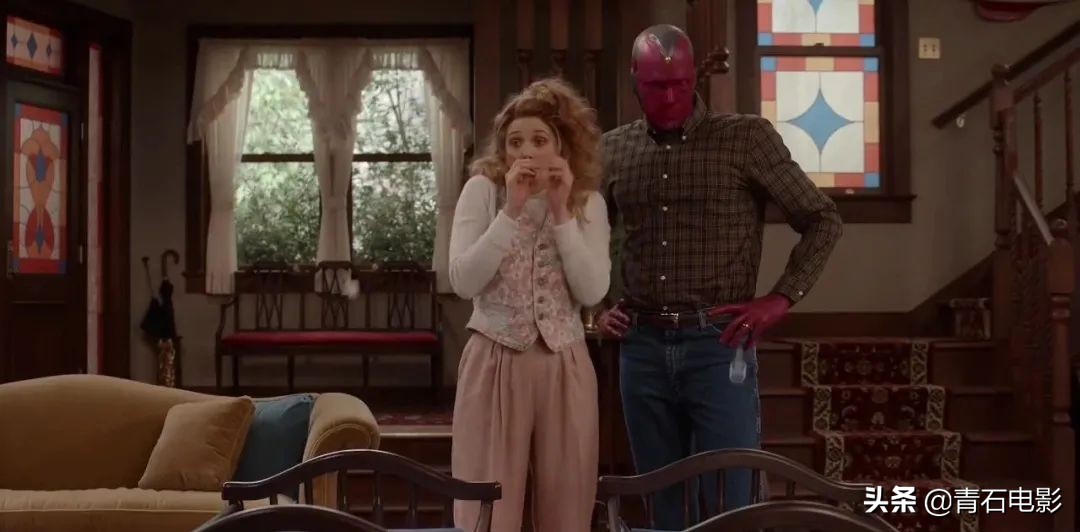 前半部分为美国经典情景喜剧风格,讲述旺达、幻视与孩子们的成长生活。
