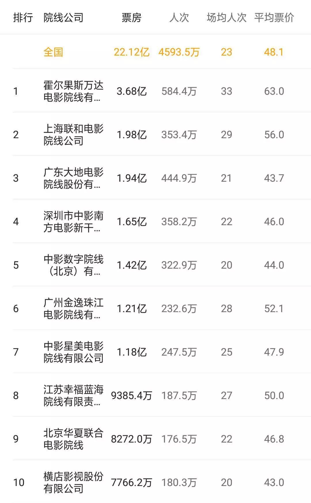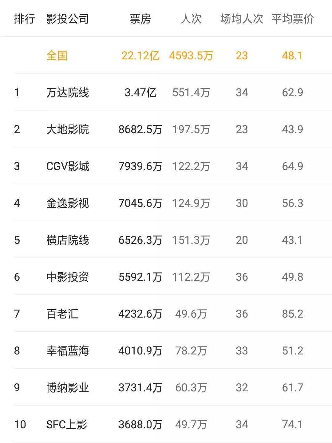 上周排在周票房首位的是霍尔果斯万达电影院线有限公司(3.68亿);往后依次是上海联合电影院线有限公司(1.98亿);广东大地电影股份有限公司(1.94亿):深圳市中影南方新干线有限公司(1.65亿);中影数字院线(北京)有限公司(1.42亿)。