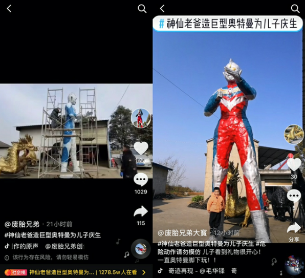 2021年1月12日,四川绵阳桂溪村的邱春宝、邱春勇兄弟和表哥范家兵用上千只废弃轮胎,打造了一个5.6米高的巨形奥特曼。