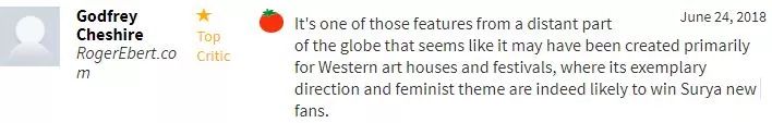 影评网站“罗杰·伊伯特网”评论:“这是世界上遥远地方的特色之一,它似乎主要是为西方的艺术影院和节日而创作的,在那里,它可效仿的执导和女权主义主题确实有可能赢得苏亚([玛琳娜的杀戮四段式]导演)的新粉丝。”