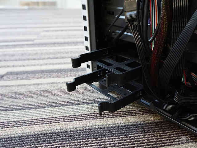预言者farseer机箱设有2个3.5英寸硬盘位采用快装设计,轻拉轻推即可取出或装上硬盘,整体的易用性不错。2.5英寸硬盘位设在机箱背板上,有2个,需采用螺丝固定的方式安装。