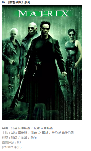"划时代的作品,本系列有《黑客帝国》、《黑客帝国2:重装上阵》、《黑客帝国3:矩阵革命》。无论是故事内容,还是电影的表现手法,都十分出众。而作为商业科幻片又蕴含丰富的哲理,带来的是视觉与心灵的双重冲击。