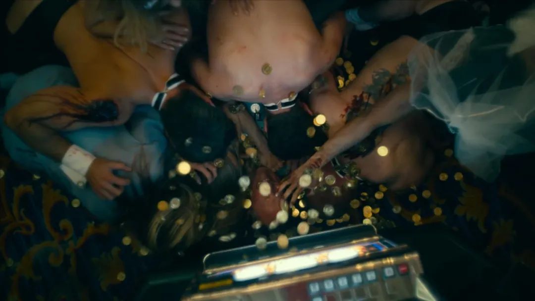 玩着老虎机的吸氧老人,在疯狂吐金币的老虎机下被一群人啃咬。