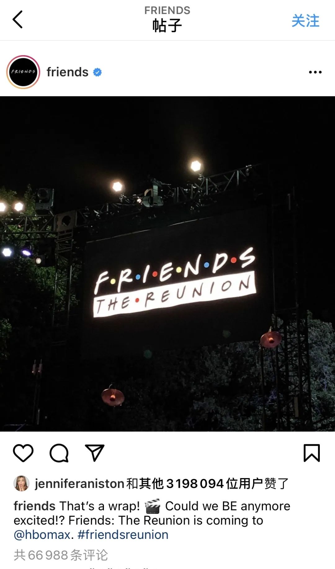 因为新冠,推了又推,今年四月官方终于发了消息,《friends the reunion》,官方消息发出来,又是三百多万个赞。