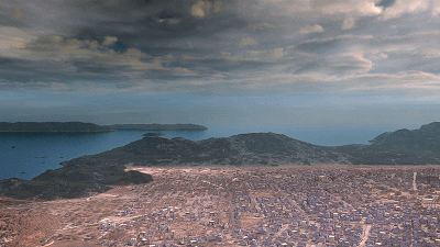 镜头从云层开始匀速向下,天空,大海,接着到高山,再由远及近,穿过海回到陆地。