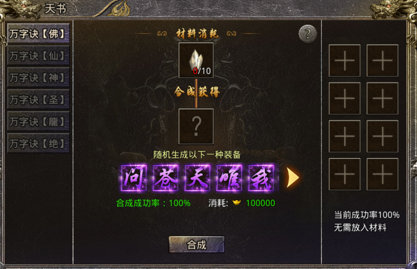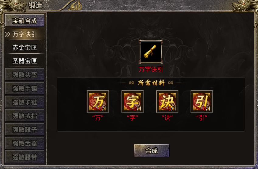 合成-锻造-宝箱合成-万字诀引,万字决引通过用"万、字、决、引"4字合成获得,合成材料随便打打怪就能掉落好多。