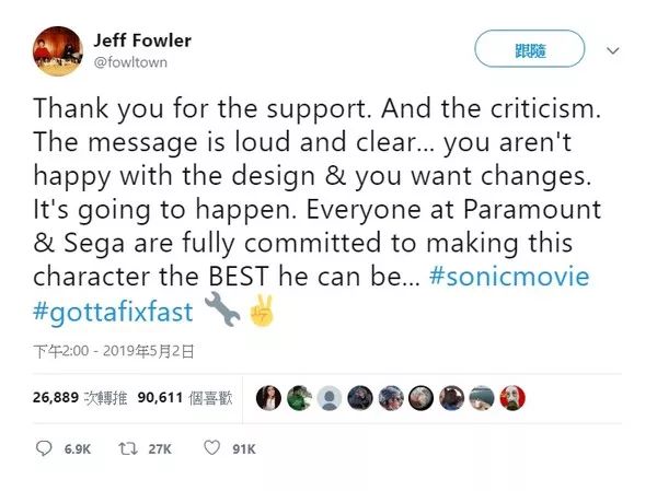 而收到来自各种渠道的批评,导演发文表示:谢谢各位的支持与批评,各位对于索尼克在电影中的设计非常不满,希望修改好的反馈,我们已经收到了,我们会与派拉蒙和sega尽全力去做到将这个角色还原到最好。