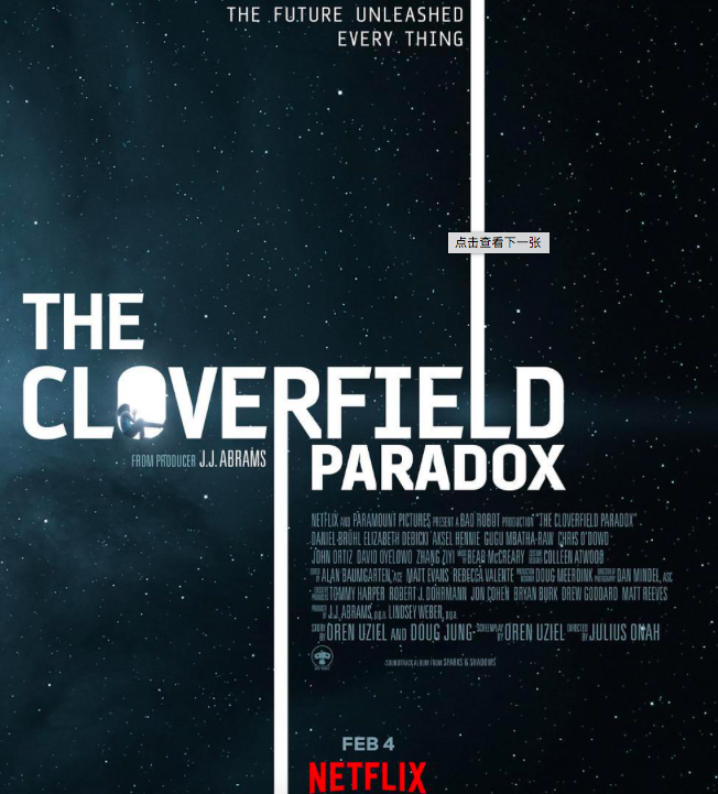 该部低成本科幻电影由julius onah执导,主要讲述一次粒子加速器意外事故导致地球整个消失,一群美国空间站的宇航员试图在逃生过程中的所遇到的未知状况与危险。和前两部“科洛弗电影”不同,此部影片的演员阵容更具国际化,汇聚英国、澳大利亚、德国等多个国家的演员,我国演员章子怡也出演了此部影片,作为星际探险家加盟作战,引来网友们的打call声一片,纷纷表示十分期待的国际章的精彩表演。