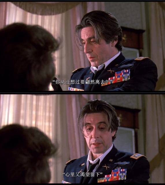 影片中的弗兰克,是一个脾气古怪的瞎老头,经常爆粗口,不仅对人严厉,还经常讽刺挖苦他人,让人很难接近,这不仅是他的一种防御方式,还在于他不想让别人看到自己的脆弱,故作坚强,而敏感脆弱正是他的内心。直到查理在阻止他自杀时,他才说出自己的真实想法:“我是坏人”、“我生活在黑暗里”、“没人愿意和我度过余生”等等。正是向查理敞开心扉的那一刻,弗兰克感受到了查理对他的爱,而这就是他们情深如父子的情感所在。