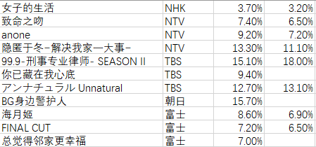 月九是富士的招牌,月九不行,富士台的其他剧更是没法看了。先来看本季目前的收视率情况。