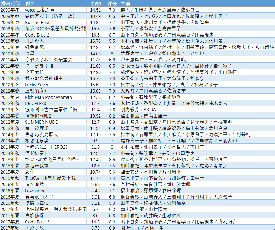 17夏季日剧收视情况 17秋季日剧收视情况前两季的情况也差不多。除了《code blue 3》有着超强的人气可以挺得住,也就《刑警弓神》意外评价不错,然而这些都不足以每集10几部新番,富士的剧几乎都是倒数的。这一季tbs的两部剧都很不错,朝日台还有木村坐镇,相比之下,富士真是没法看了。至于富士是如何一步步毁掉他们的黄金招牌月九的,那就是另一个问题了。