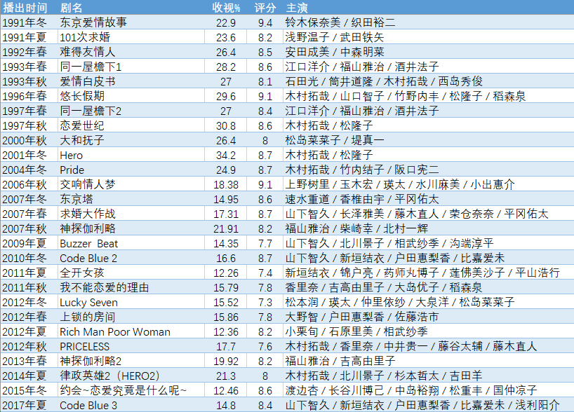 “月九不行了!”“月九跌下神坛!”这样的声音出来也不是一天两天了。作为富士台甚至是日剧的黄金招牌,曾经有众多超高收视的经典日剧在月九档播出,比如《东京爱情故事》、《hero》、《悠长假期》等等。曾经的月九就是质量和收视的保证。