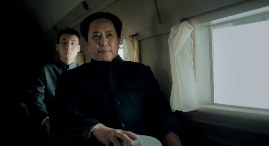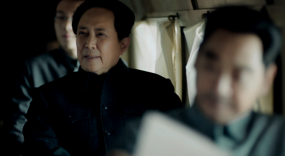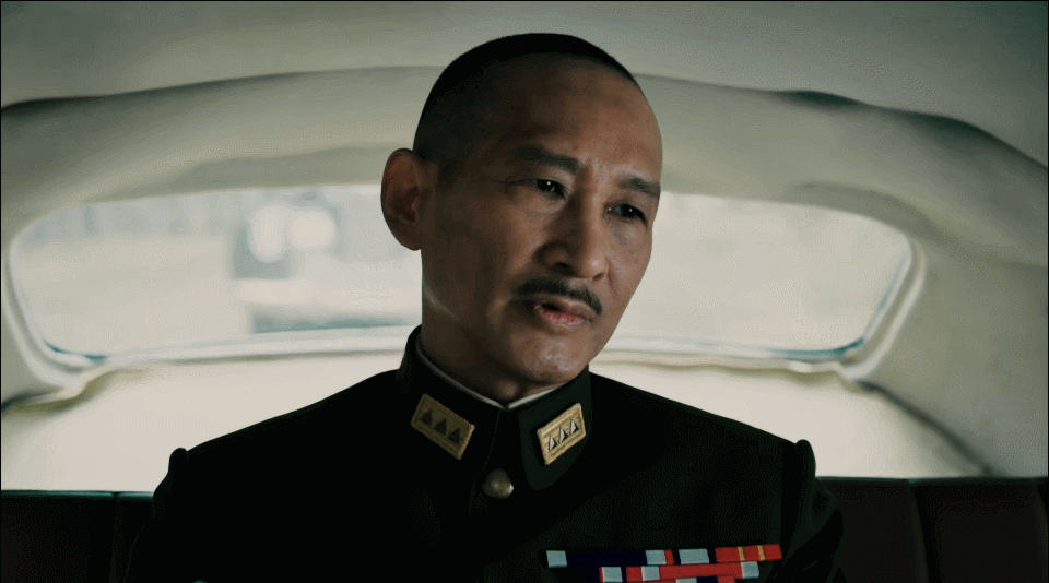 蒋介石出场,是在去机场迎接毛主席一行人的路上。坐在车后座的蒋介石显然若有所思,想着什么。