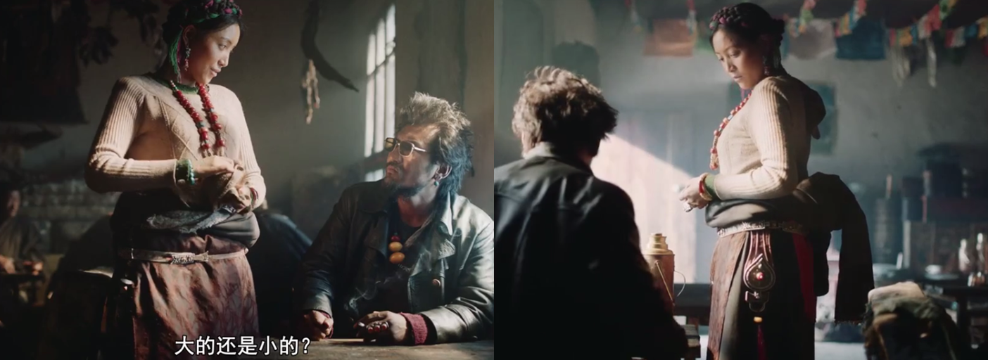 金巴解决了羊的问题之后,开车来到“康巴茶馆”打探消息。此时,电影再度通过镜头,暗示了两个金巴是同一个人。