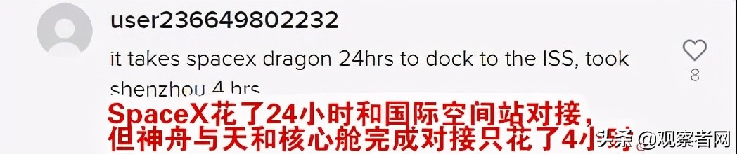 这一“历史性时刻”到来后——17日,有网友在tiktok的视频下方评论感叹,神舟十二号只花了4小时,就完成了对接。