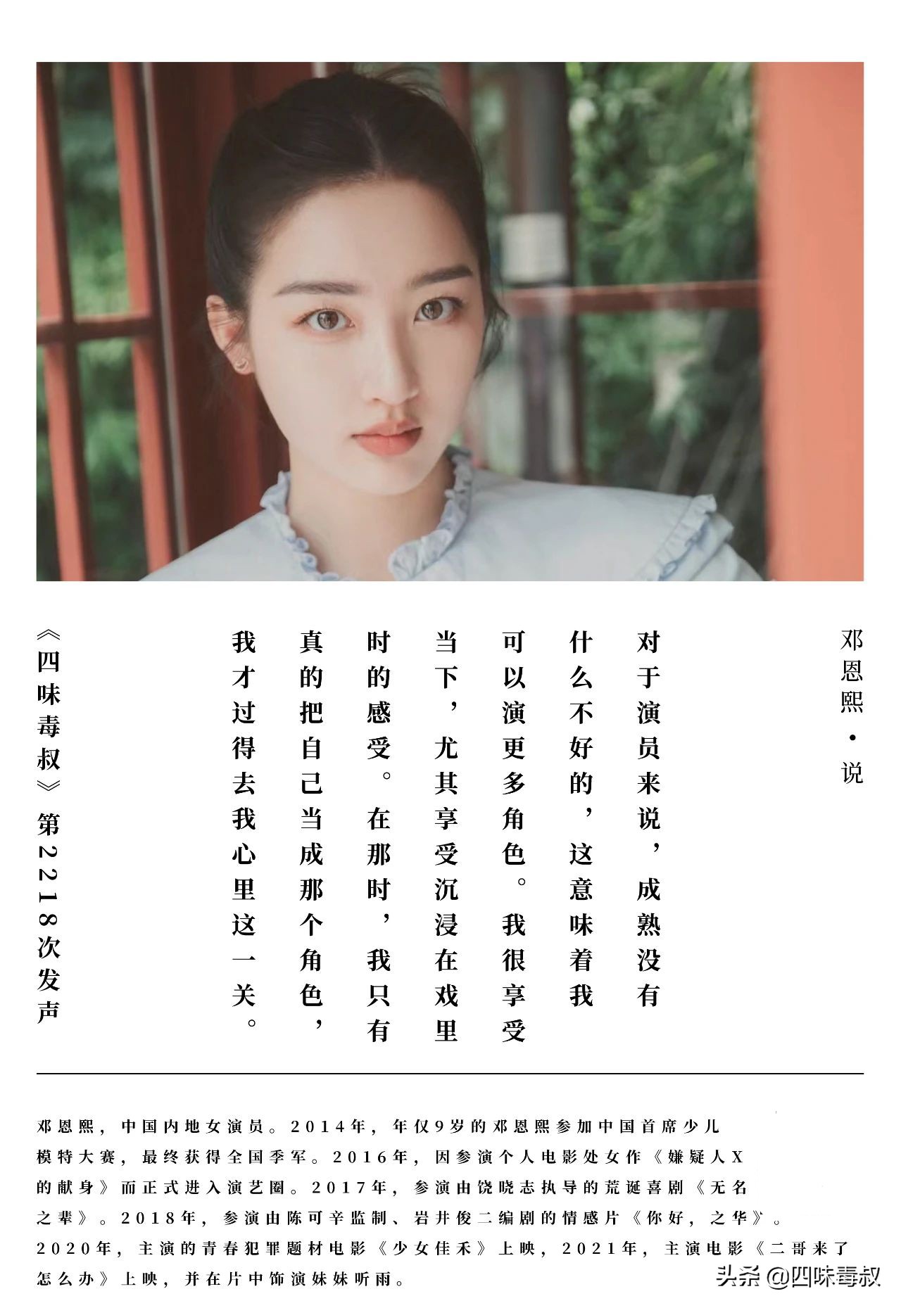 邓恩熙:我倒没有怕人家说,我9岁的时候就有人说我像13、14岁,每一年都在递进我的年龄。记得有一次,我跟我妈妈出去,在出租车上,司机就说“这是你姐姐吧?好年轻。”那会儿我才9岁,听到这话我不知道该做何感想,但我妈倒是挺开心的,脸上一直洋溢着笑容。其实我觉得对于演员来说,成熟没有什么不好的,我可以演更多的角色,我也不在乎大家说什么。