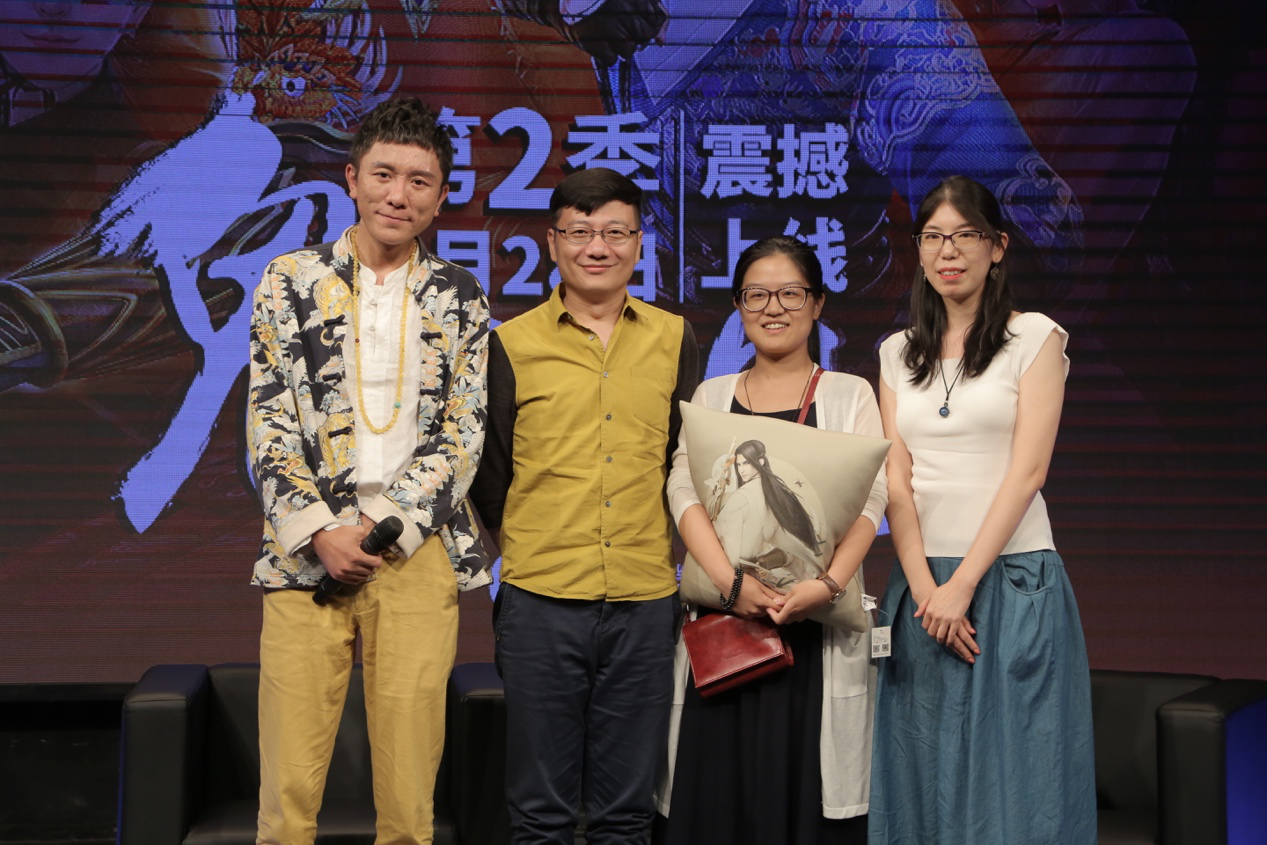 图:从右至左为里巴巴文化娱乐集团大优酷事业群动漫中心制片人、《少年锦衣卫》制片人、总编剧孙甜,获奖粉丝,光合积木创始人、《少年锦衣卫》配音导演姜广涛,柏言映画ceo、《少年锦衣卫》总导演陈柏言